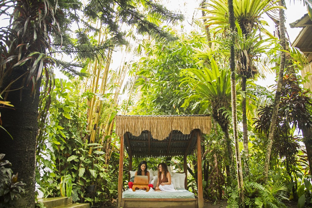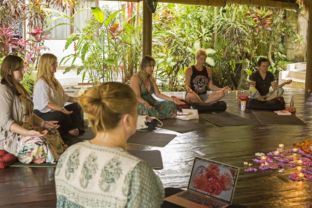Tropical Balinese gardens framed by mountains and rice paddy fields, a stunning undercover shala to sit in circle, outstanding restaurant, and gorgeous nooks and private cabanas for writing.